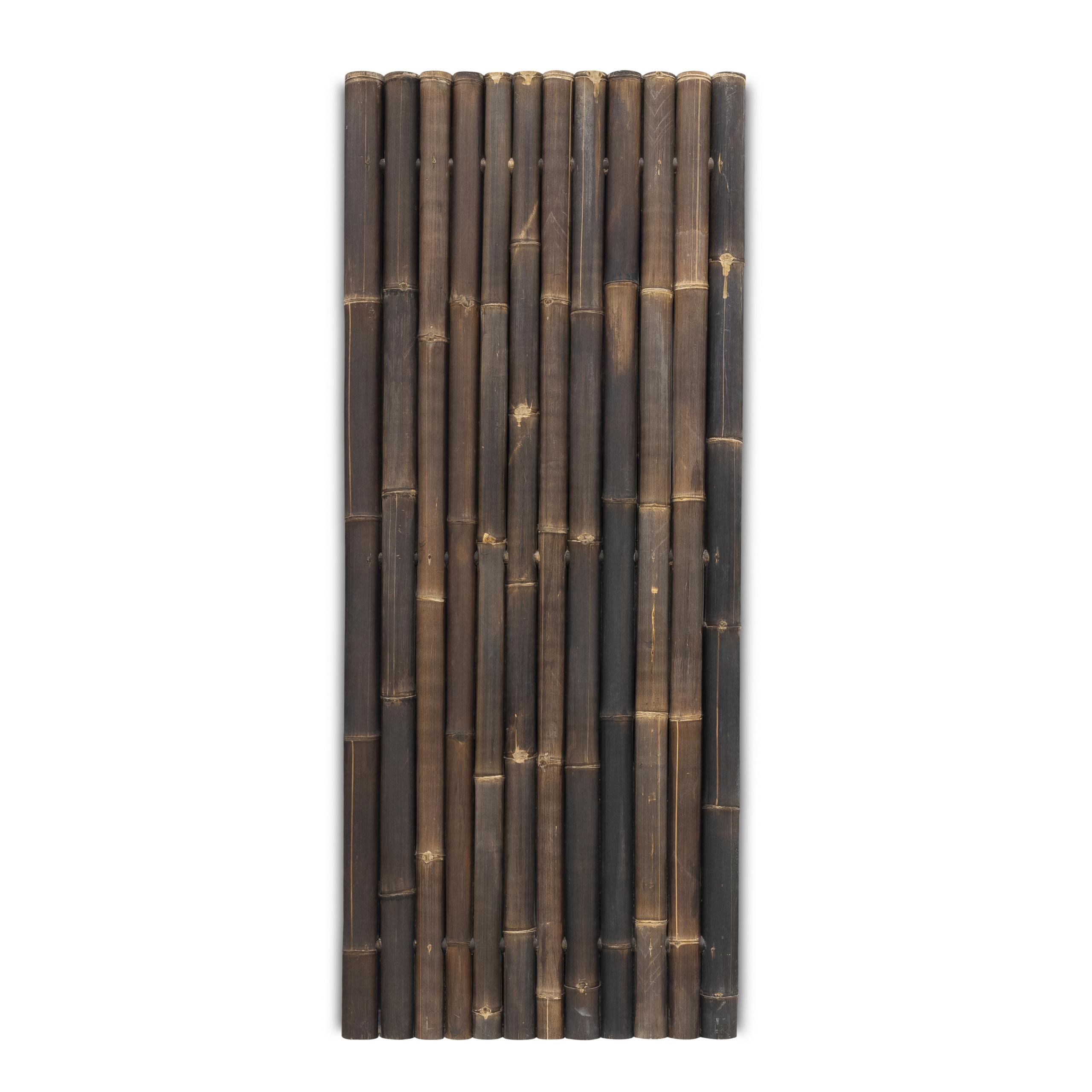 Bambuszaun 90 x 220 cm, hergestellt aus breiten Bambusstäben. Dieser Sichtschutz hat eine dunkle Farbe. Im Handumdrehen ein Urlaubsgefühl im eigenen Garten, wer will das nicht? Die Stangen haben einen Durchmesser von 6-9 cm und werden über horizontale Bambusrohre miteinander verbunden.
