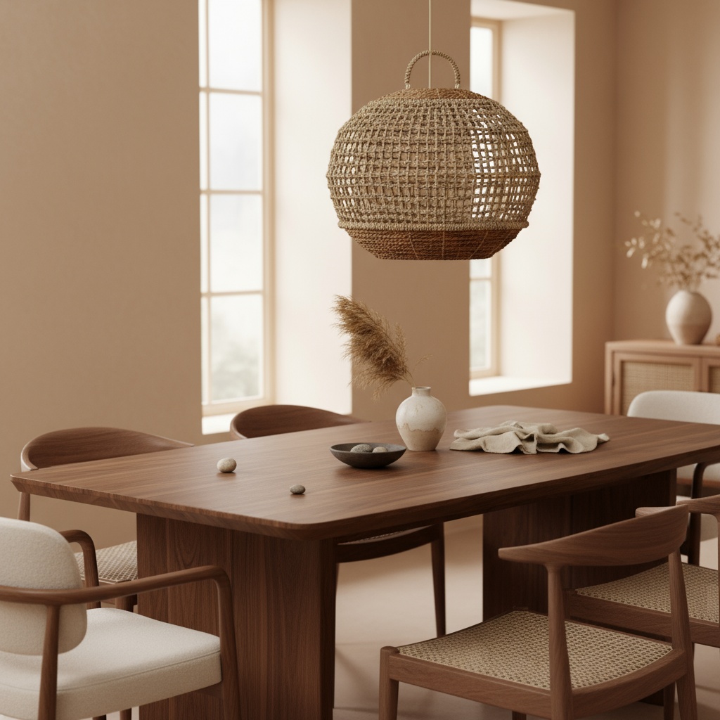 Wenn die Lampe leuchtet, filtern die Naturfasern sanft das Licht und verbreiten ein warmes, stimmungsvolles Licht im Raum. Die Lampe eignet sich über dem Esstisch, im Wohnzimmer oder als Akzent in einer hohen Diele.